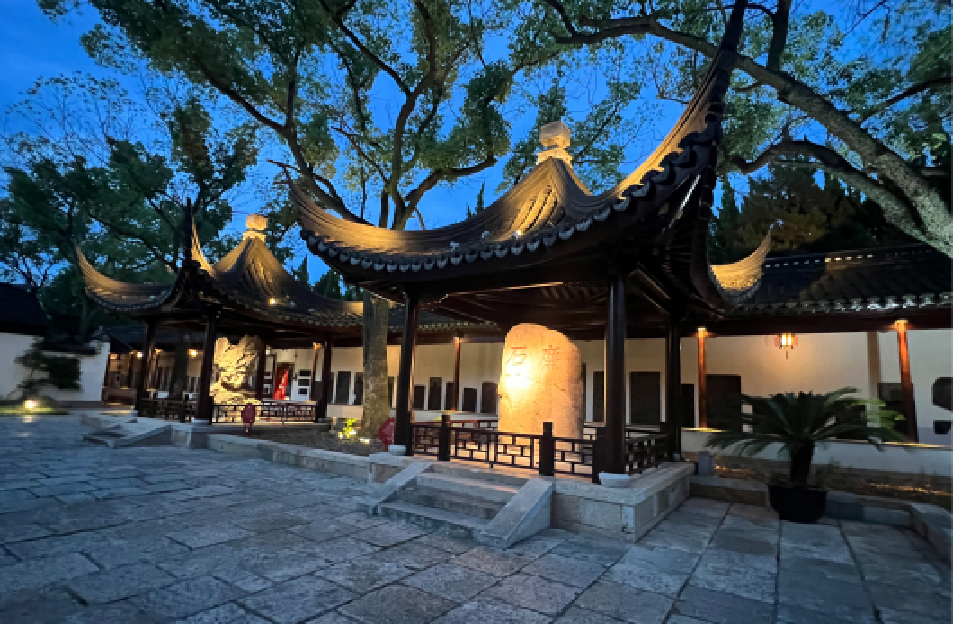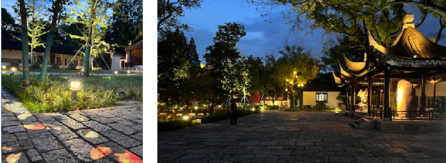 蘇州碑刻博物館位于江蘇省蘇州市府學(xué)文廟內(nèi),是一座收藏、研究、陳列和復(fù)制古代碑刻的專題類博物館。以明倫堂為主視覺中心,重點突出其屋頂?shù)奈菥臁⑽莺团?再由北往南逐級下降,清風(fēng)堂和雙石亭次亮,以主要結(jié)構(gòu)照明為主;左右碑廊則是化處理,增加廊柱外側(cè)點綴照明。園路以東廟部分的石材草坪燈低位照明統(tǒng)一,替換并調(diào)整原有燈位,實現(xiàn)虛實光影的錯落秩序感;還原古園林的古樸淡雅氛圍空間層次。